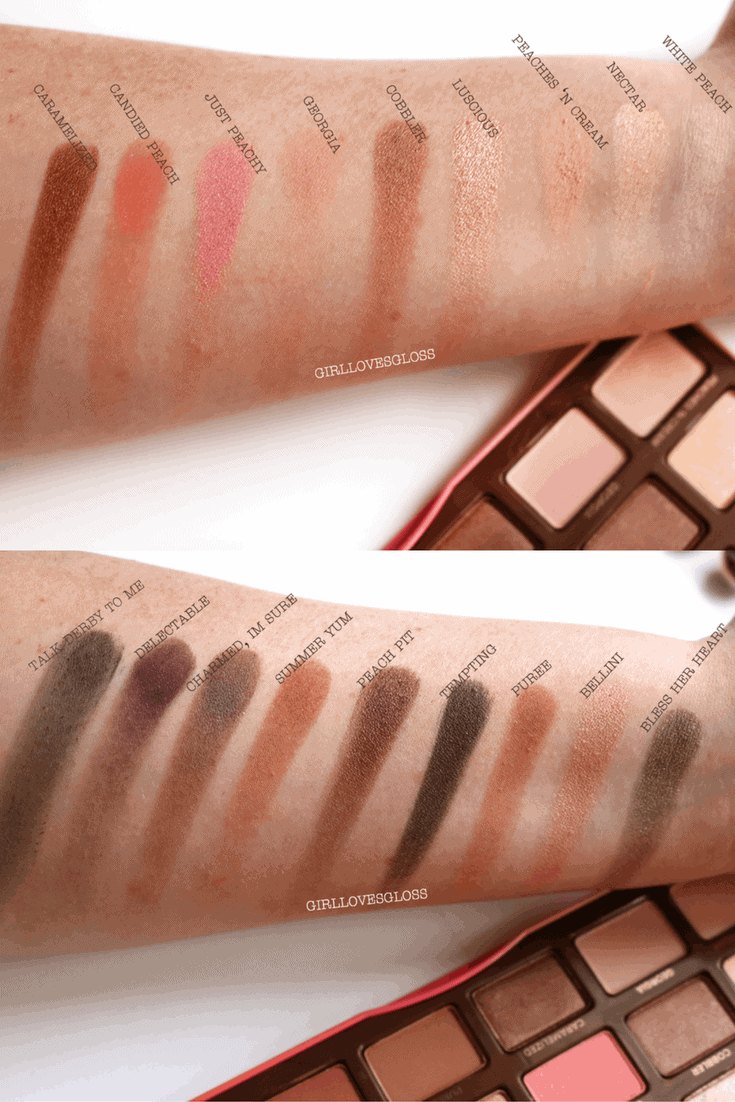 Most of the shadows have really good pigmentation, with a token of slight under performers (not surprisingly the purple/plum shadows need a decent base to build up pigmentation which is common for Too Faced). I was really pleasantly surprised at how pigmented the paler shades were, feeling smoother in texture than I am used to with the brand. I would say there is only one real true dud in the palette, in the shade of Talk Derby to Me, which in the pan looks like a plum-navy, but on the skin looks like a muddy black. Shades Puree and Summer Yum are surprisingly similar with barely a tonal difference but Summer Yum is slightly darker. There are some shades that didn’t actually swatch well (Georgia, White Peach) that applied much better with a brush, and some shades that perform exceptionally (Caramelized, Peach Pit, Bellini).